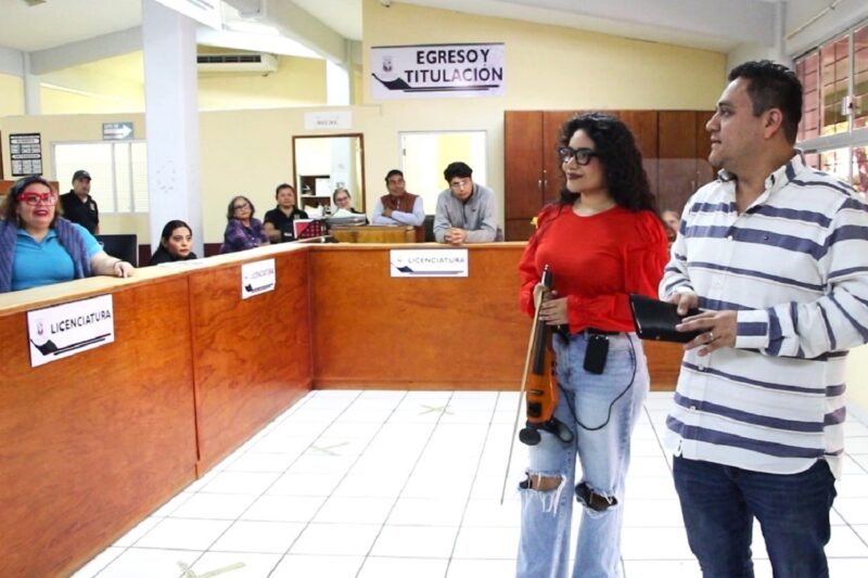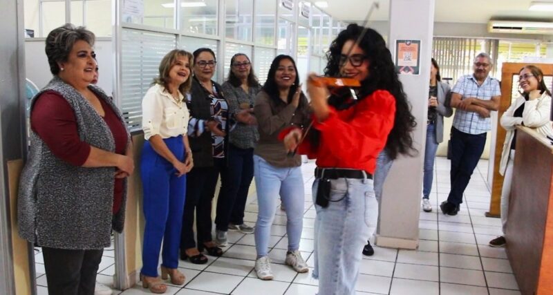 TUXTLA GUTIÉRREZ, Chiapas; 11 de noviembre de 2025.- Una mañana habitual de trabajo en la Universidad Autónoma de Ciencias y Artes de Chiapas (UNICACH), se convirtió en un momento especial cuando la violinista Carolina Ruiz irrumpió con una interpretación musical en la Dirección de Servicios Escolares. Así inició el programa “Pausas Culturales”, que se extenderá a todas las áreas de la institución.